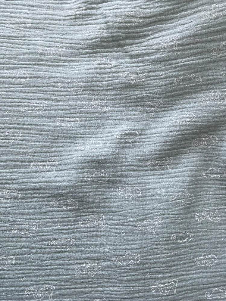 Mušelín v pastelové zelené barvě s potiskem mořských koníků je dvouvrstvým materiálem, který je vhodný na každodenní nošení, splývavý, vzdušný a lehký. Mušelín je možno použít na dětské výrobky, dečky, osušky i lehké letní šaty, sukně, tuniky, šátky apod.