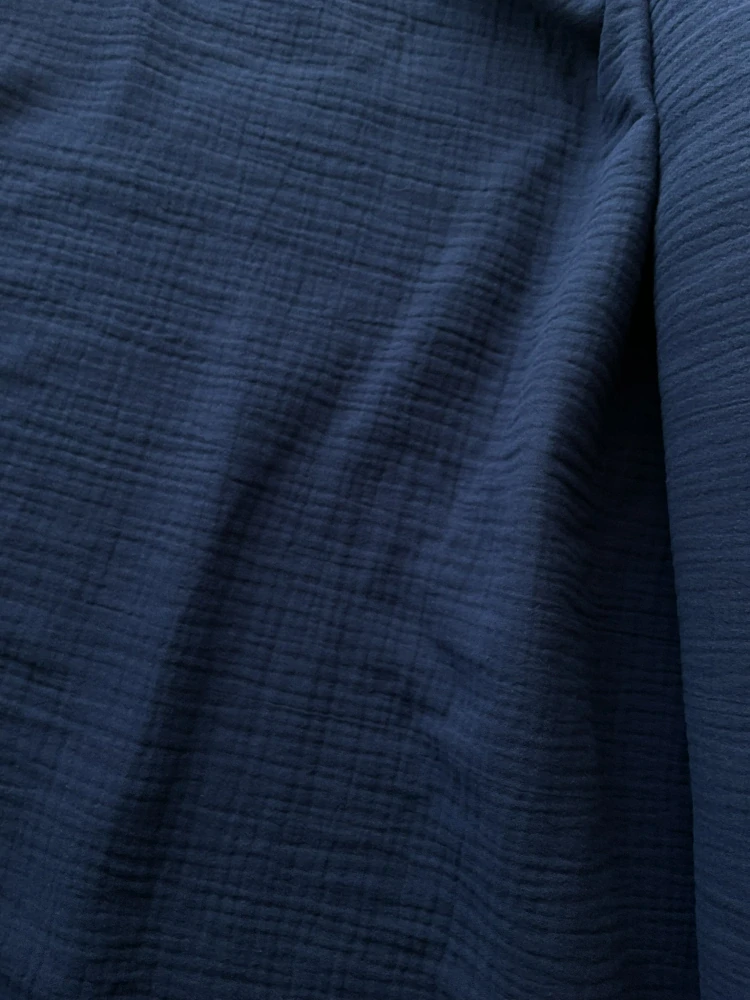 Mušelín v půlnoční modré barvě je dvouvrstvým materiálem, který je vhodný na každodenní nošení, splývavý, vzdušný a lehký. Mušelín je možno použít na dětské výrobky, dečky, osušky i lehké letní šaty, sukně, tuniky, šátky apod.